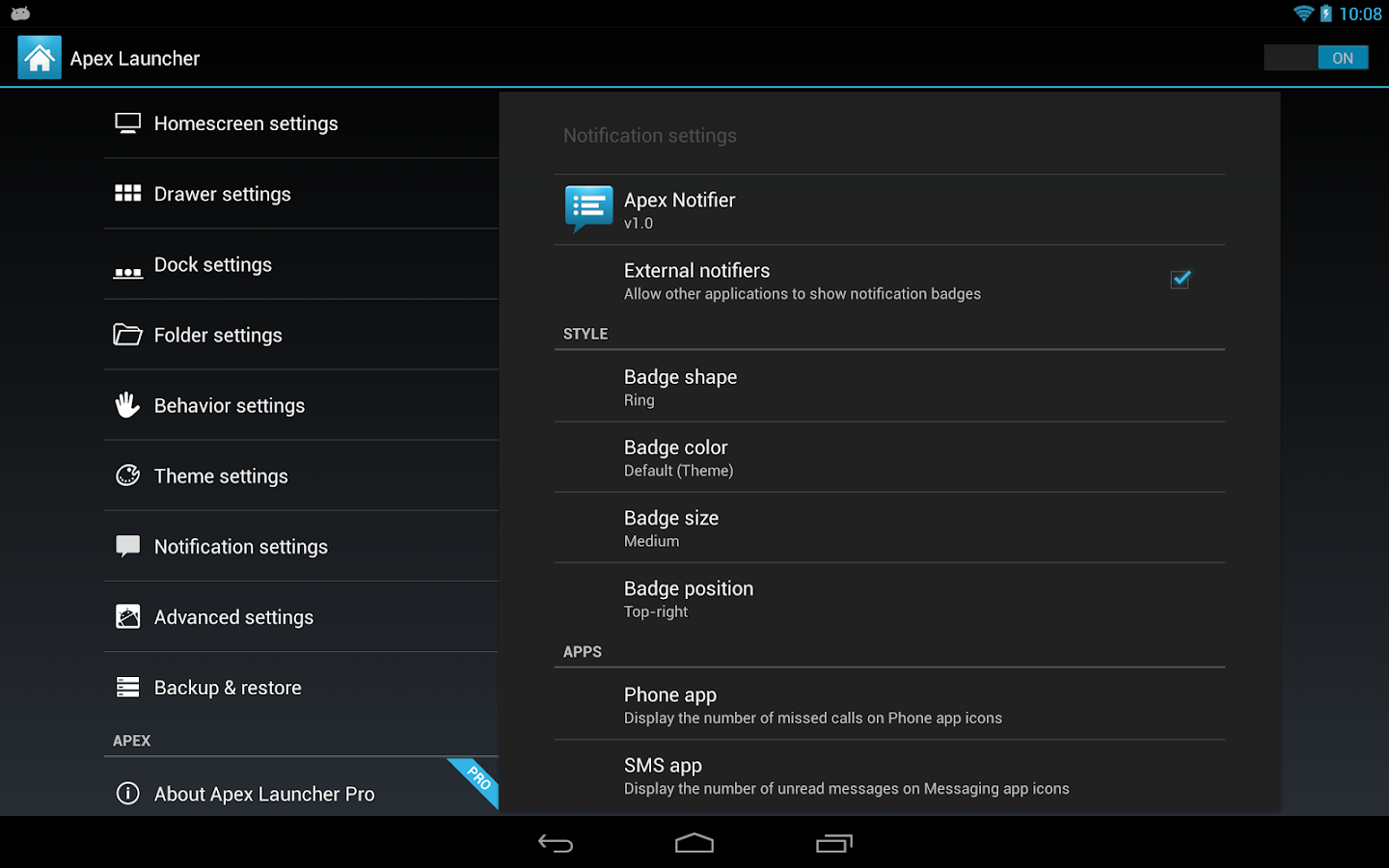 Apex Launcher helps you create a customized homescreen experience on your Android (4.0+) device. Apex Launcher Pro unlocks the following features:• Powerful drawer customizations (unlimited drawer tabs, folders in drawer)